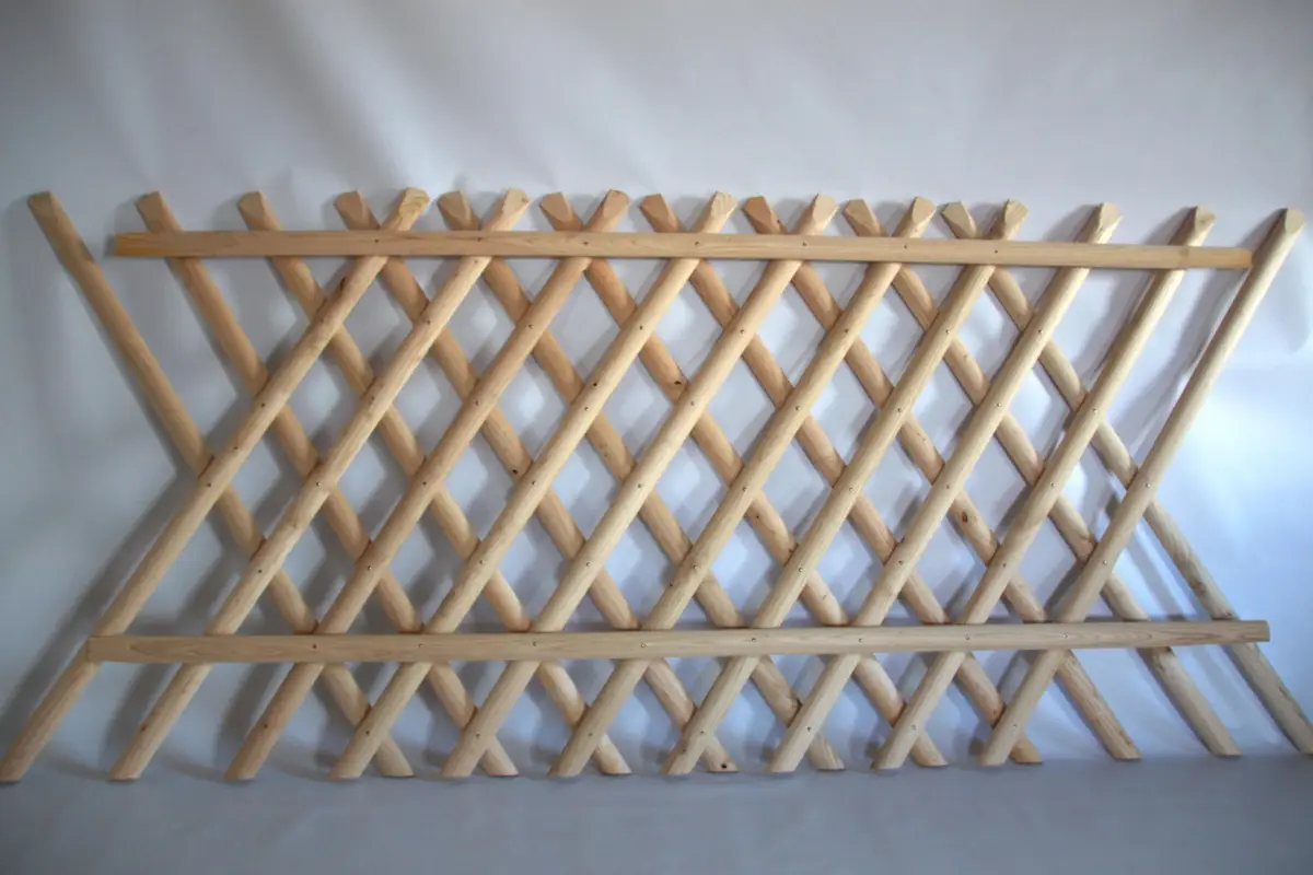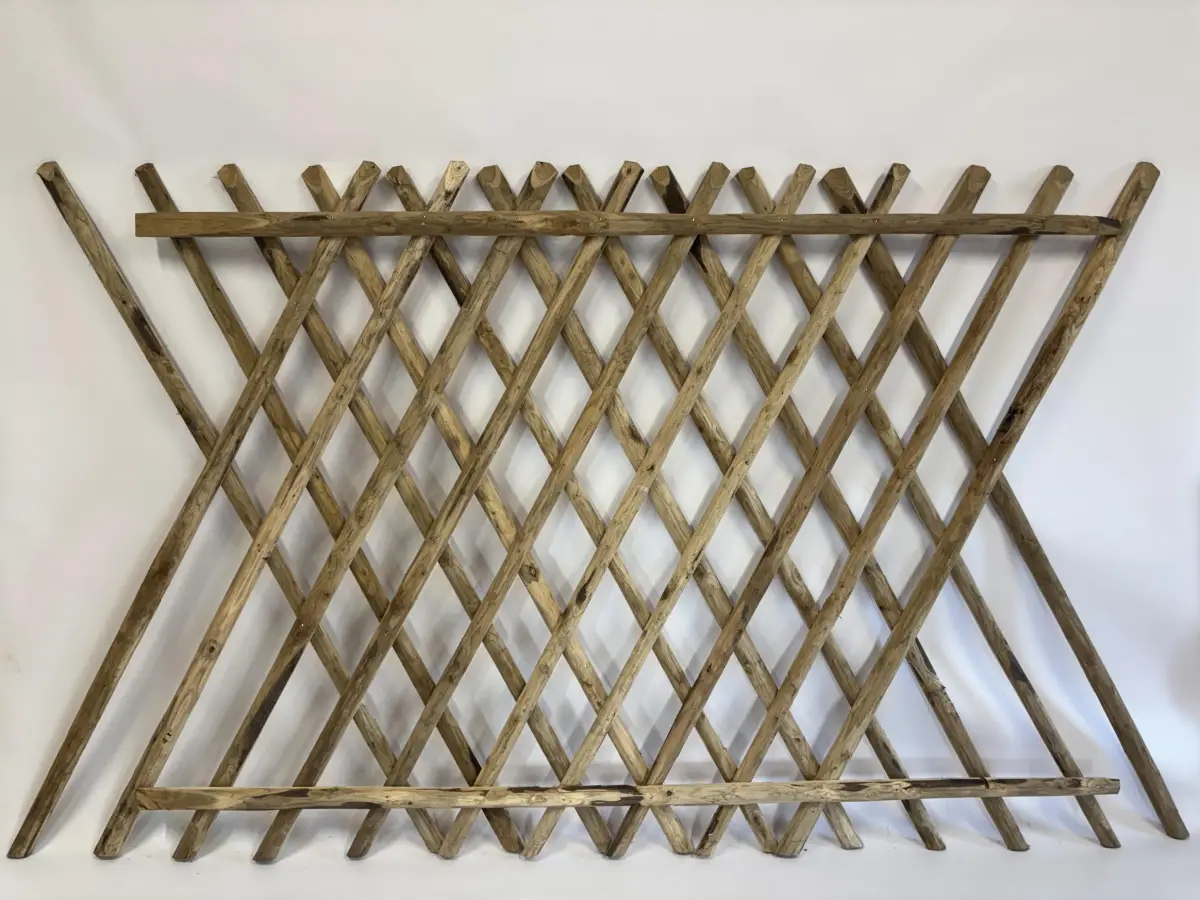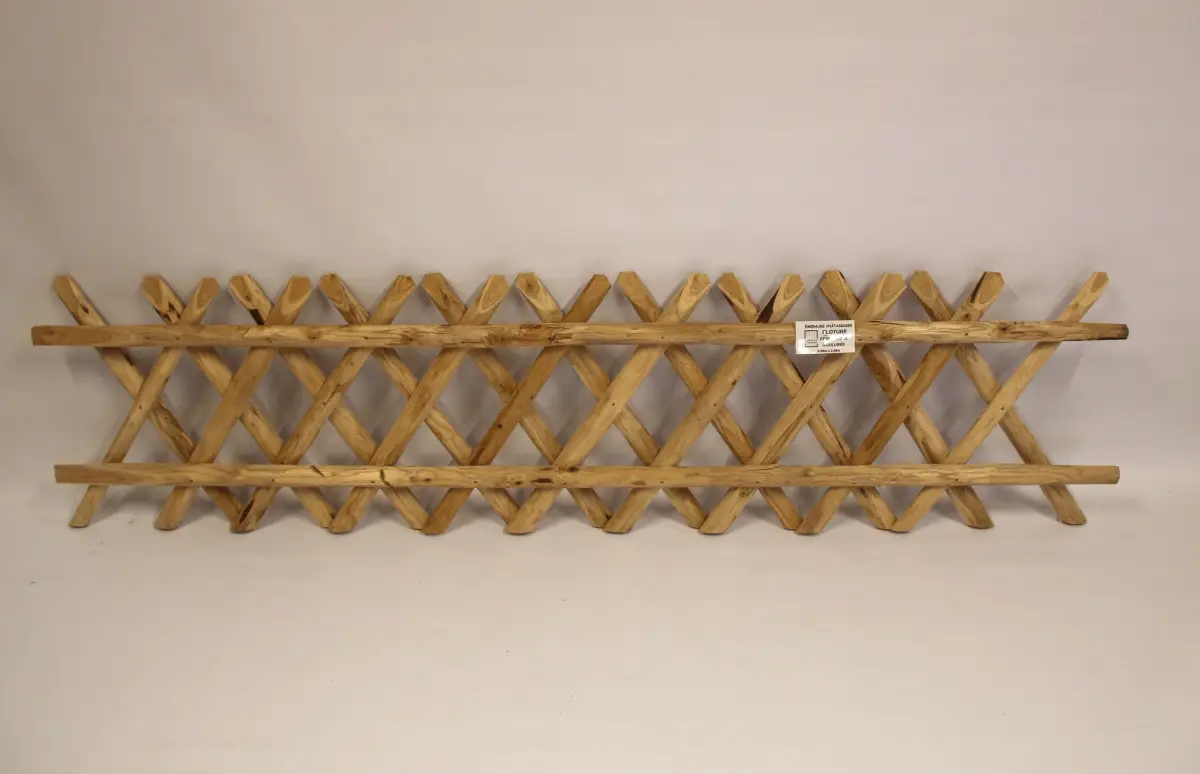 L’assemblage en croisillon à maille losange de 12 cm est réalisés avec des échalas moulurés ou dressés. Nos panneaux font 1m85 de longueur utile et peuvent s’abouter les uns aux autres. Ils peuvent être posés sur des piquets châtaignier écorcés et pointés.