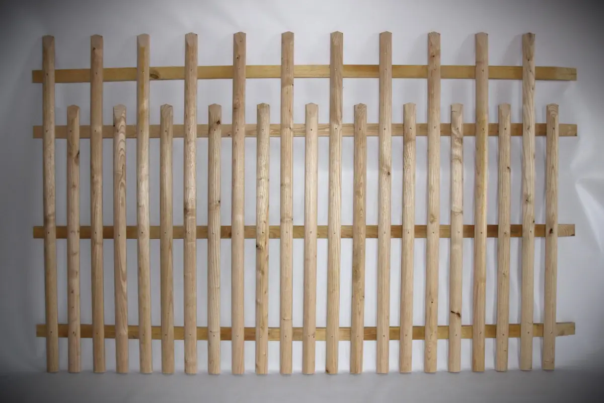 - Montants : Échalas moulurés (demi-ronds usinés de section 45mm * 22mm, identiques et lisses)