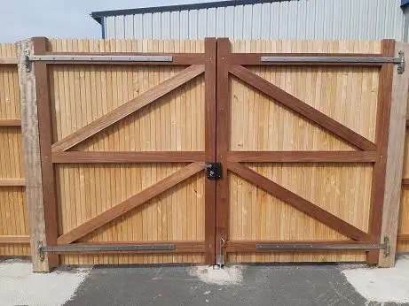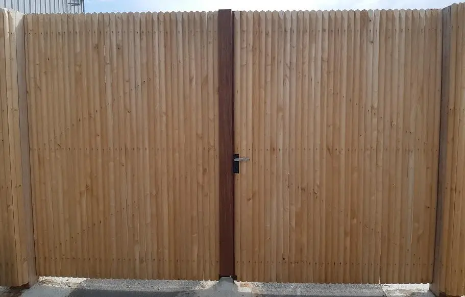 Fixer sur des poteaux bois carrés, de section adaptée à la dimension et à l’habillage du portail.